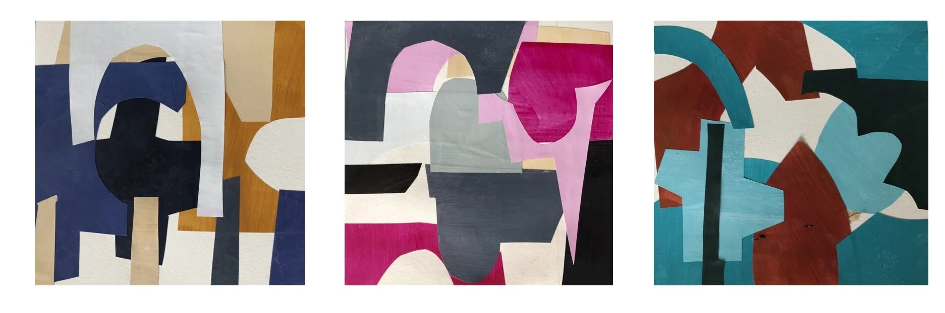 Three little collages showing different colour interactions. Neutrals were carefully chosen for their colour temperature: for example purple darks for the yellow piece on the left. My visual language here is drawn from the French countryside (where I teach art most years): steeples, crosses, and arches.